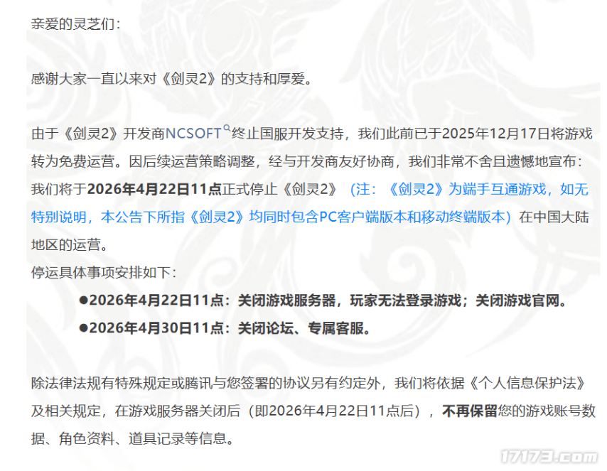 同时,《剑灵2》国服也正式发布了一份停运公告,将于2026年4月22日11点正式停止《剑灵2》,并于4月30日11点:关闭论坛、专属客服。