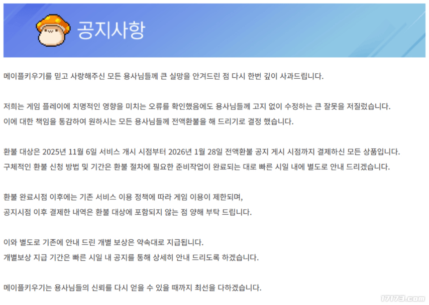 1月28日,Nexon宣布为其手游《冒险岛养成记》启动大规模全额退款:针对自2025年11月6日上线至2026年1月28日期间所有充值,凡申请退款的玩家均可获得100%返还,总金额预计高达数百亿韩元。