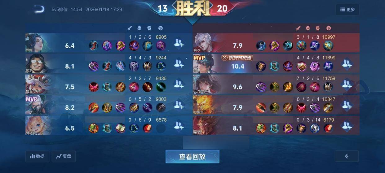 这局可以看到对面兰陵王是mvp,证明还是会玩的,我们的死亡次数只有一,证明意识和操作到位嬴政不是很害怕兰陵王,有一定的反制空间,加上炽热支配和极寒风暴,那想切死也没有那么容易。关键就是跟队友离得近一点,别落点,状态不好别漏视野就不会出大问题。