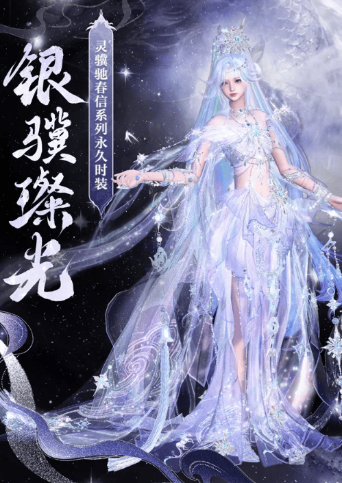 女款的【银骥璨光】主打一个清透自然,身上诸多配饰晶莹闪亮,同时时装造型也灵动自然,乍一看好似仙女一般绚烂夺目,无论身处三界何方,都能成为万众瞩目的焦点。
