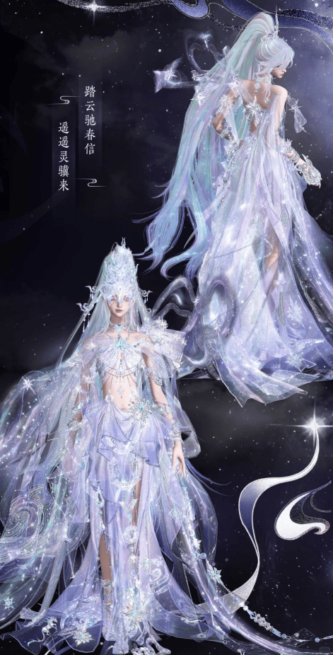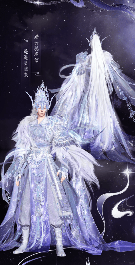 【银骥璨光】男款以银白为主调,银丝勾勒的神骏纹路暗藏锋芒,腰束宽幅银封且肩胸线条凌厉,行走间自带驰骋星野之姿;女款露腰长裙渐变款,襟前靛青芒轨饰件灵动吸睛,行则微漾星辉,在光线下的虹彩隐现,抬手间袖拂云影,宛如银骥衔春踏星而来。