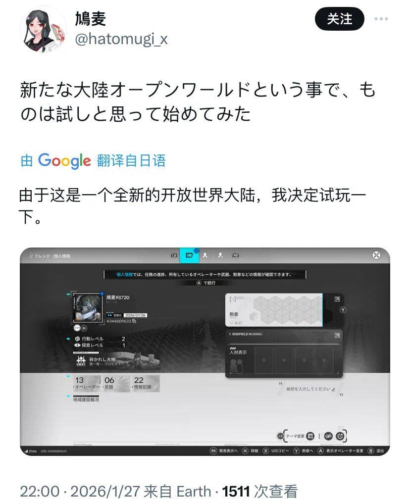 你以为手谈姬是在开玩笑?不不不,姬这么说是因为真的有玩家玩到了隐藏版《终末地》,请看vcr:1月28日,有位海外玩家发推,晒出了自己的游戏截图,不过,怎么看着和别的玩家的不太一样?