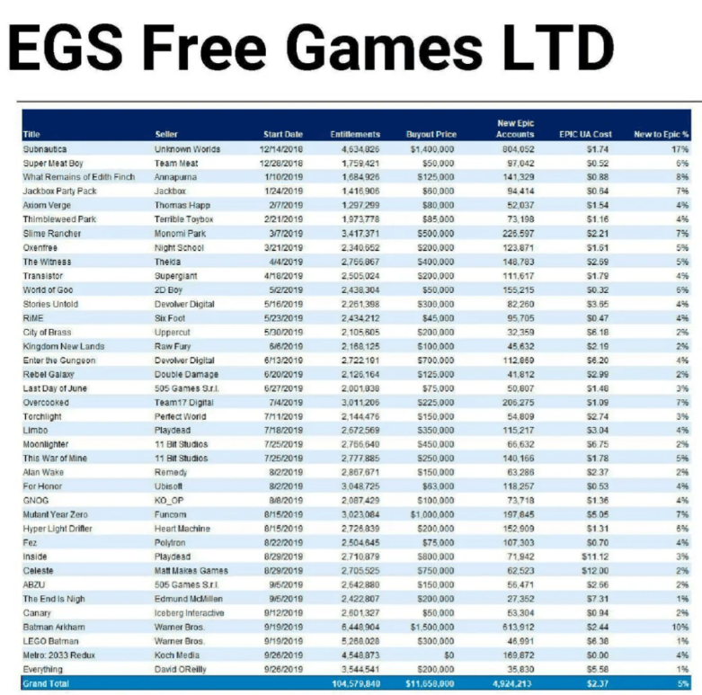 根据前些年Epic和苹果闹上法庭时流出的内部文件来看,Epic在2019年的9个月内送出38款游戏,耗费超过1160万美元。算上后续送出的《GTA5》《死亡搁浅》《霍格沃茨之遗》等大作,业界估计Epic 在“免费游戏买断”上的累计支出已经在1.5亿至2亿美元之间。