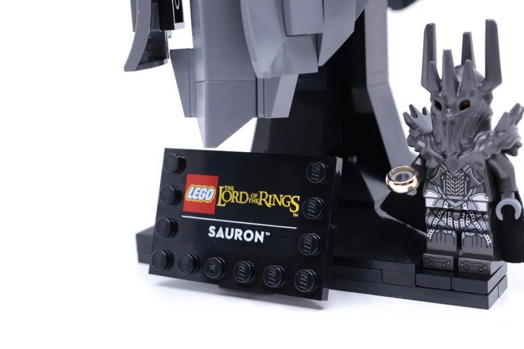 底座前配备了一块印刷铭牌,上面印有乐高指环王标志及“索伦”字样,为展示提供了恰如其分的注解。