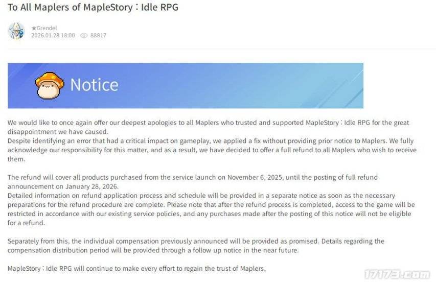 官方还公布了补偿措施,就是从开服到2026年1月28日期间,充值消费的玩家可全额退款,但是申请退款后这个帐号就会被官方永久封号。