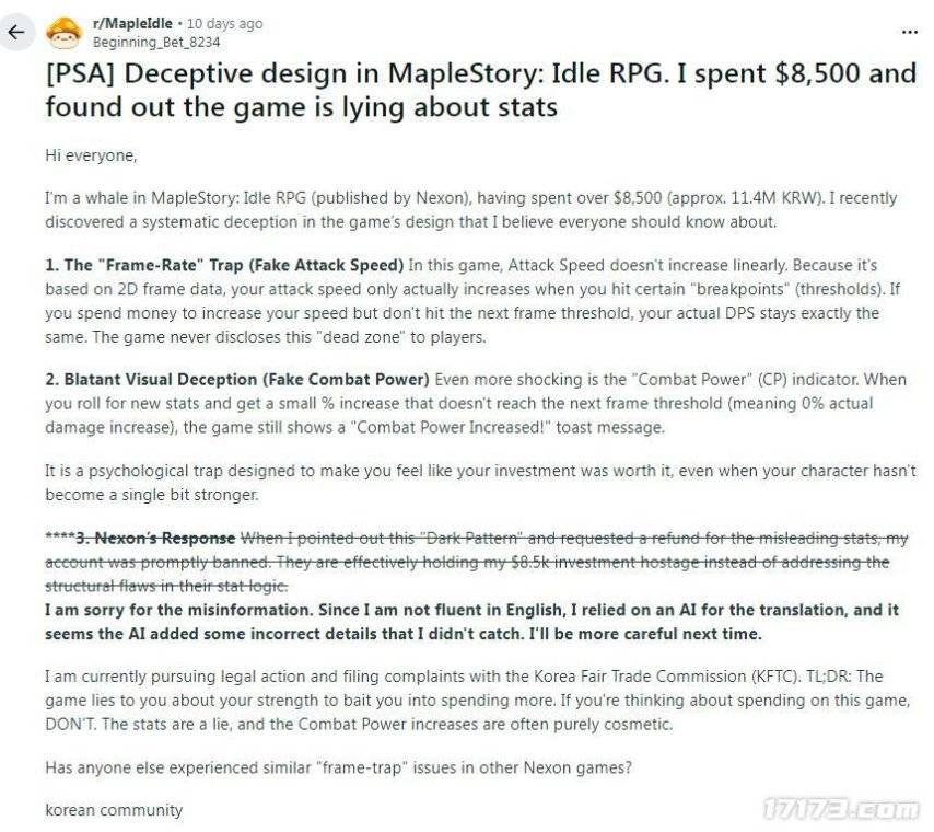 网友Beginning_Bet_8234是《枫之谷:放置冒险记》玩家,前段时间他根据台服玩家的一篇深度剖析文进行测试,然后发现游戏存在欺诈行为,或者是严重的BUG。