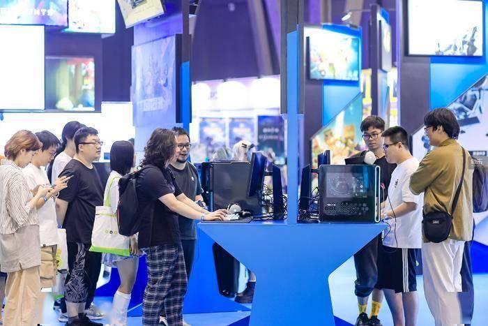 场地中央是开拓芯游戏展区,错落有致地分布着一些展示台,展示台最上方是一块屏幕,中间是游戏名称和宣传图,桌面上放着安装了Demo的电脑。如果有玩家来试玩,路过的人能从屏幕上看到游戏的实况。