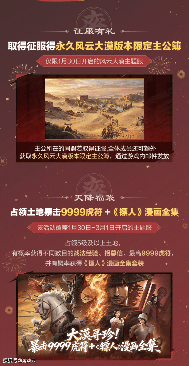 目前,“风云大漠”主题服已正式开启。这场汇聚文化、武侠与策略的跨次元盛宴机不可失。赶快召集盟友,共赴大漠,体验一番“既争霸天下,又重塑山河”的豪情!