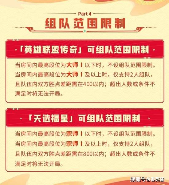 “英雄联盟传奇”模式下,当房间内最高段位为大师以下时不设组队范围限制,达到大师及以上时仅支持2人组队且队伍内双方胜点差距需在400以内。“天选福星”模式下,宗师以下不设限制,宗师及以上仅支持2人组队且胜点差距需在800以内。