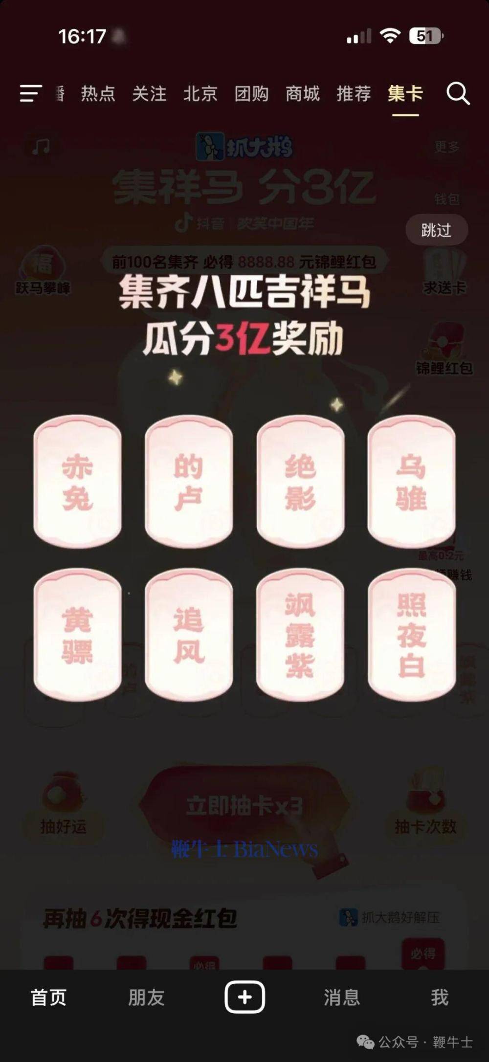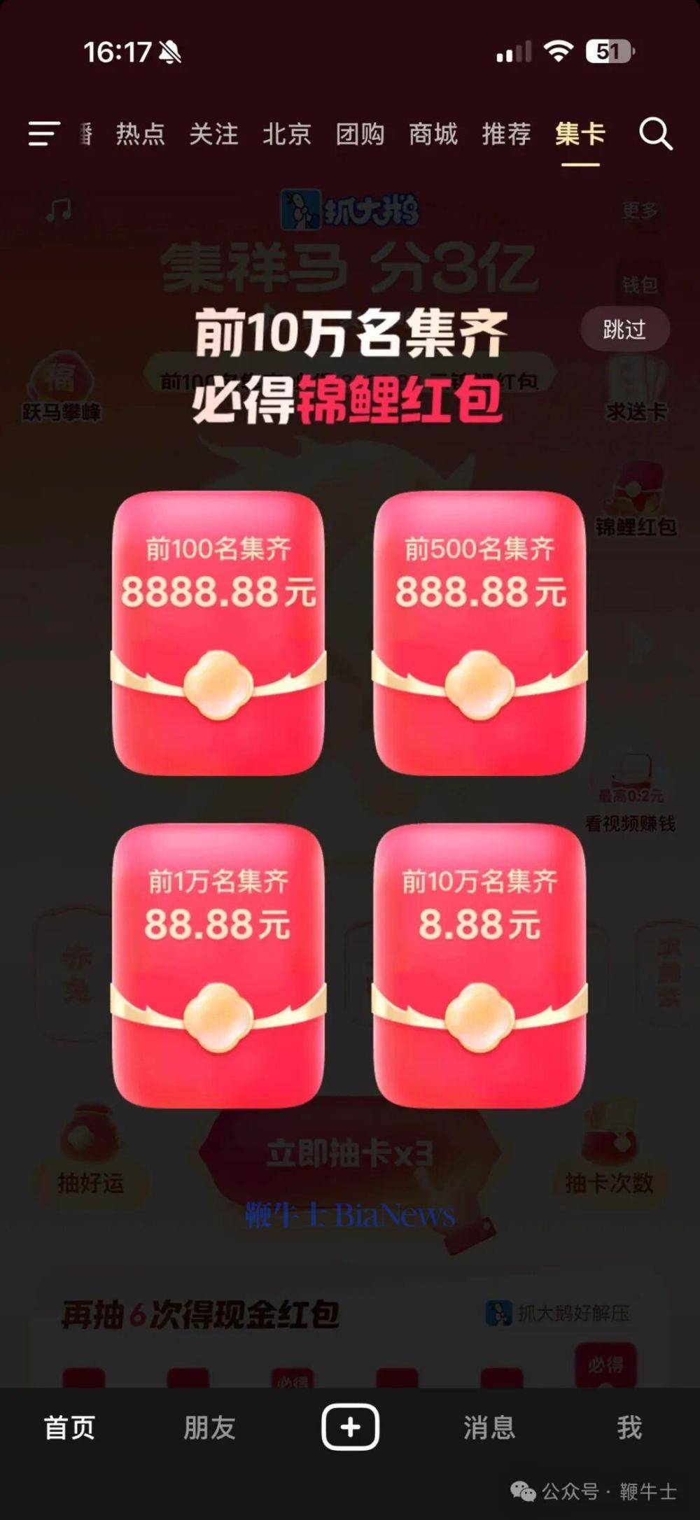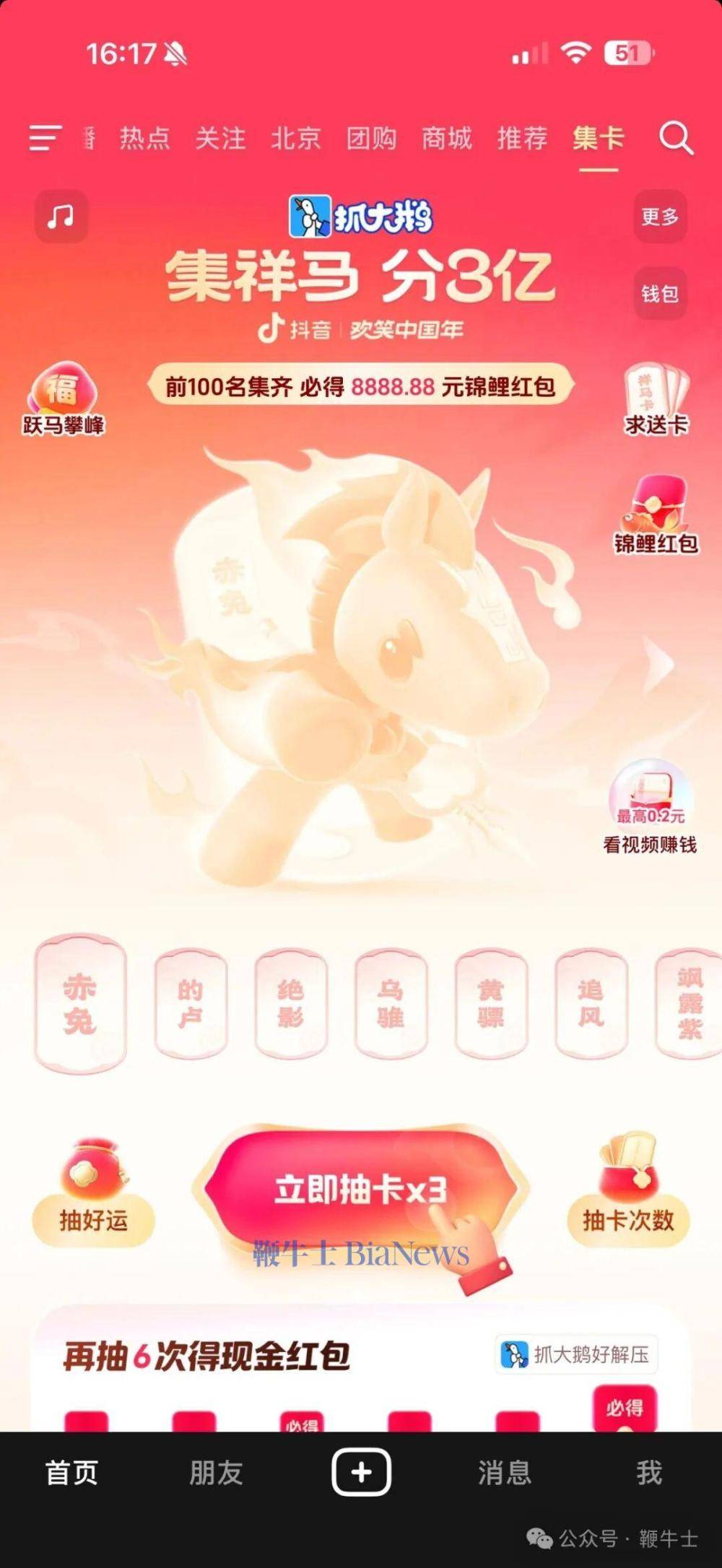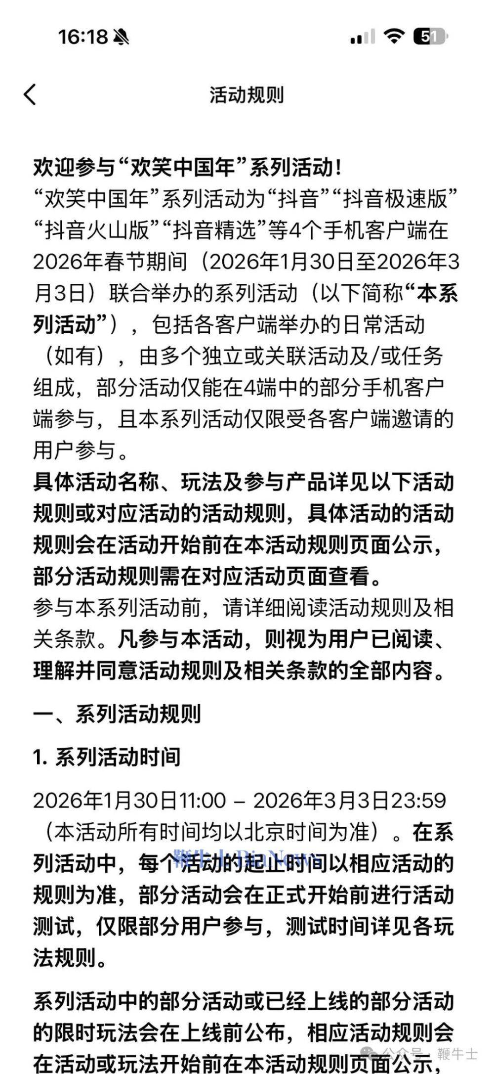 活动规则。春节大战真的开始了。前有元宝发10亿红包,后有千问发30亿免单,之前百度APP发5亿,今天抖音发3亿,这样,已知大厂红包加起来已有48亿了。