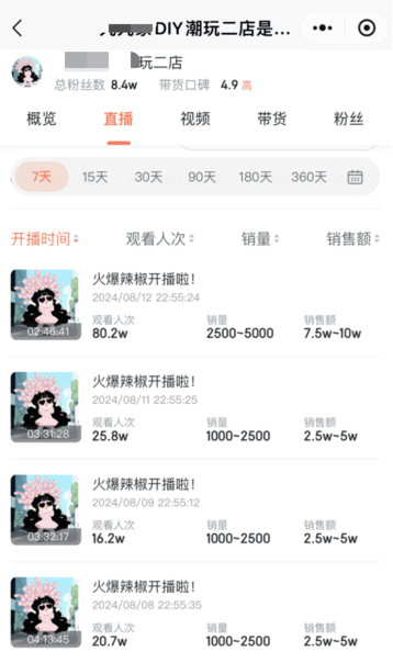 8月12日播了2个小时,观看人次超过80万,卖出了2500+单,日销售额在7.5万元-10万元之间。