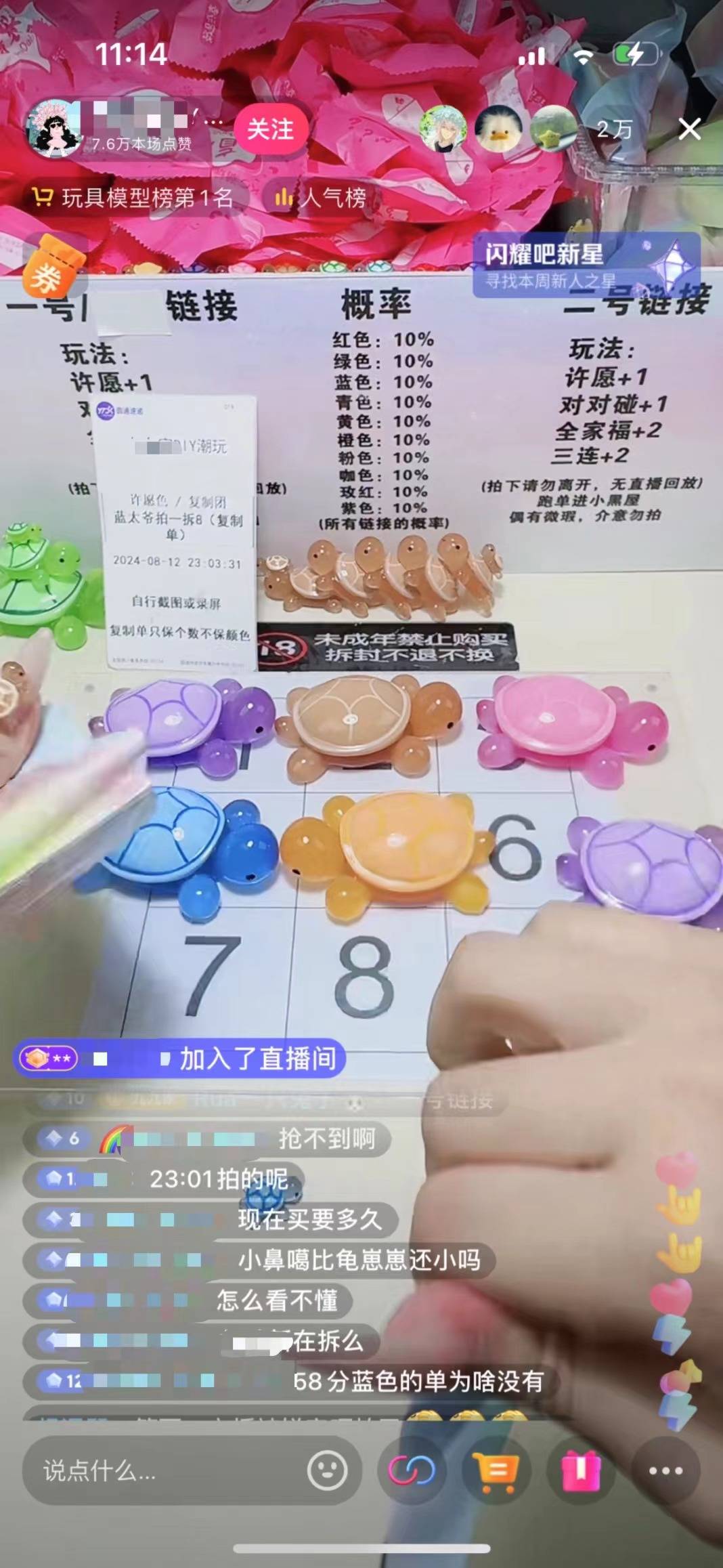 如果运气好,送的两个盲盒拆开后又和原有的凑出了三个同色小乌龟,像消消乐一样触发三连消除,主播此时会再送几个新盲盒,继续拆,如果依然触发加拆,那就继续送继续拆。直到再没一样的,拆盲盒游戏就结束了。
