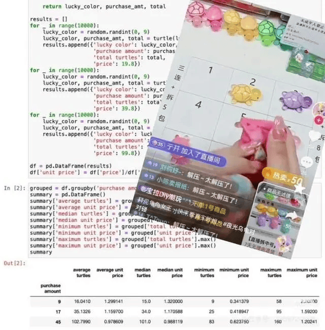 一位网友经过Python测算,他按照某直播间里的商品规格,分别对每种价格进行了10000次模拟,根据模拟分布,购买售价为19.8元时有50%的概率拆到15个以内,而购买99.8元时拆到100个的概率也大约为50%。