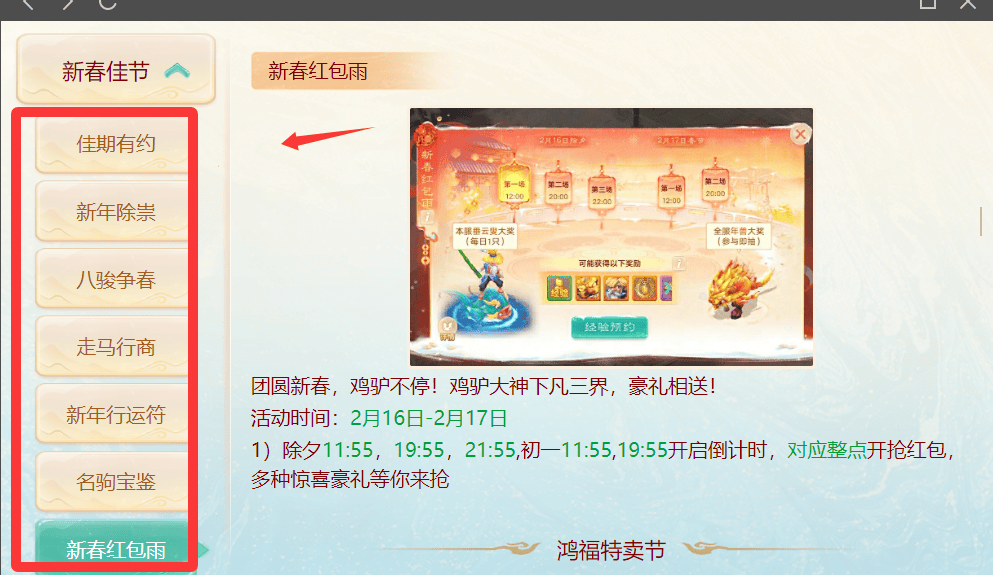 从奖励方面来看,只要完成对应的任务,就可以福糕,聚魄丹等豪礼,除夕当天11:55,19:55,21:55,初一11:55,19:55开启倒计时,对应整点开抢红包。建议大家可以像叶子猪一样组个五开固定队,小队能快速完成任务,把一箩筐春节奖励全部收入囊中。