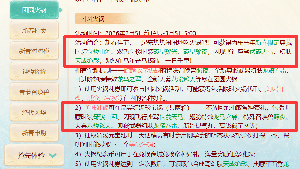 全新飞行座驾【伏羲天马】更是一个陆空双栖座驾,参与行商活动还能额外获得1张座驾抽奖道具——火锅礼券,大年夜一边打着边炉一边参加团圆火锅,美味油碟还能抽取各种好礼,边玩边赚钱,还是很享受的嘛!