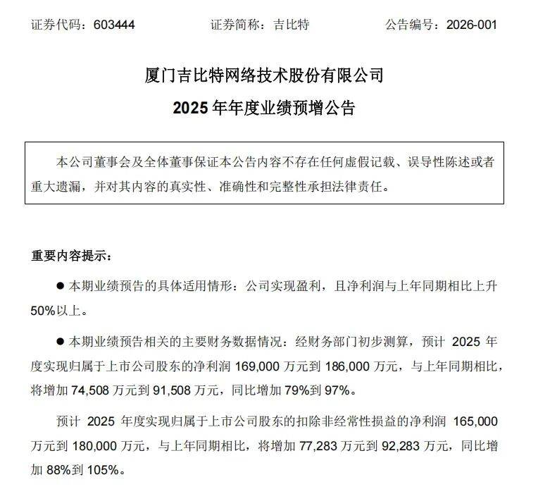 根据2025年年度业绩预增公告,吉比特全年净利润预计大幅增长。2025年度该公司预计实现归属于上市公司股东的净利润16.9亿元到18.6亿元,较2024年同期的9.45亿元增加7.45亿元到9.15亿元,同比增幅79%到97%;扣除非经常性损益的净利润,预计为16.5亿元到18.0亿元,同比增加88%到105%。