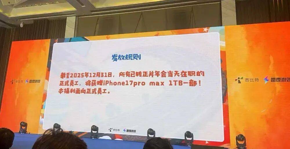 根据吉比特员工在朋友圈分享的照片,截至2025年12月31日,吉比特所有已转正、并年会当天在职的正式员工将获赠iPhone17 Pro Max 1TB一部