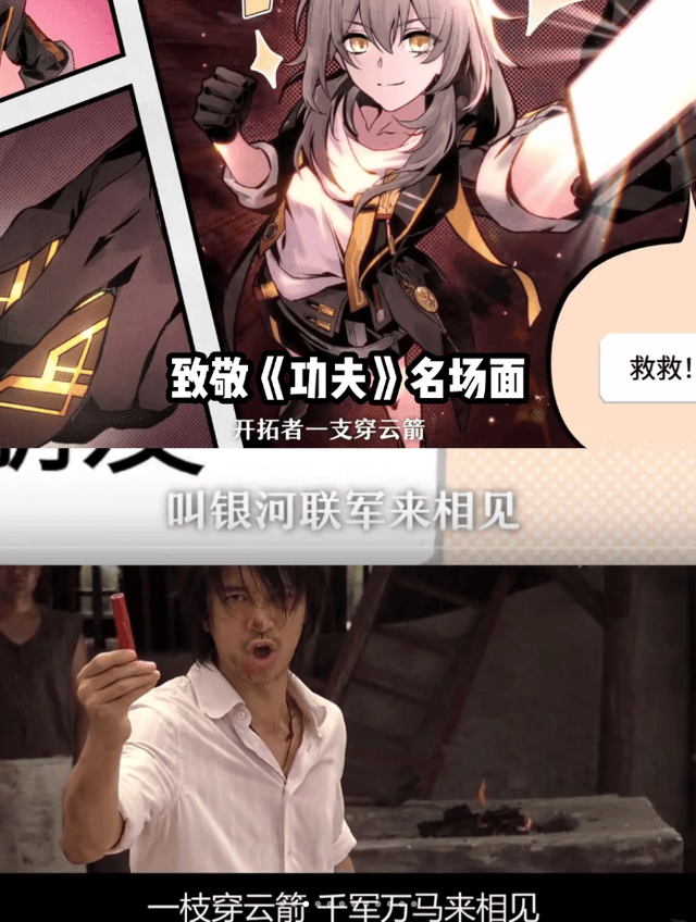 开拓者不敌铁墓,于是高呼“救救我”手持一支穿云箭,千军万马来相见,这段致敬了周星驰《功夫》的桥段,向天空投掷斧头帮的烟花,摇人支援: