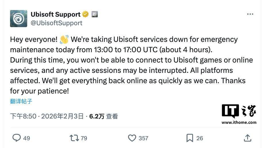 IT之家 2 月 3 日消息,育碧(Ubisoft)于北京时间今晚 9 点开始对旗下多款游戏的服务器进行紧急停机维护,涉及《彩虹六号围攻 X》、《全境封锁》、《飙酷车神》、《刺客信条》、《荣耀战魂》等,维护预计将于北京时间 2 月 4 日(明天)凌晨 1 点结束。