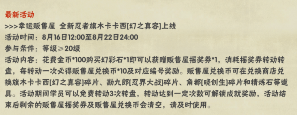 在前几天官方预告了更新的活动内容,其中并没有提到幻之真容卡卡西。本来以为这个忍者最快也要下周上架了,结果没想到周三提前更新了正式公告,并且宣布幻之真容卡卡西在本周五上架。这样一个人气并不低,活动预告都完全不提到的忍者,就这么临时安排上架了?不过招募形式还是很多玩家完全没想到的形式,居然是跟团购忍者一样的定位幸运贩售屋。我之前猜测过这个渠道,但感觉概率不大,没想到魔方还真是这么做了。