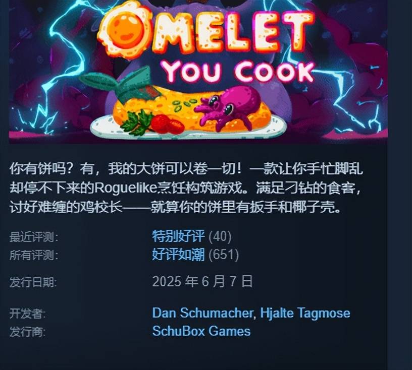本作由两位来自于德国的独立开发者打造,他们对游戏的热爱从玩家的社区评论中体现的淋漓尽致:许多玩家反复强调"更新频率非常夸张、每周都有新内容"!在正式版发售后,相信《Omelet You Cook(你有饼吗?)》的内容惊喜也会一直延续下去。