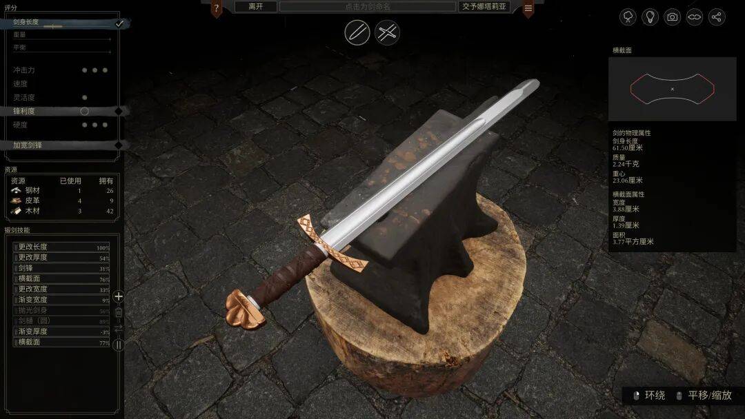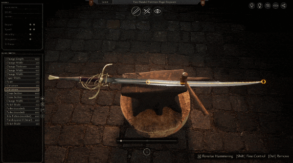 每一把武器都从一块原始铁胚开始:锻造过程中,玩家需要逐步塑造剑身的长度、宽度、厚度、锋线变化以及横截面的坡度。这些参数在历史兵器研究和专业建模软件中十分常见,而游戏选择将它们完整地纳入交互流程——不同的是,参数并不是通过数值面板或者滑块来调整,而是由一次次锤击决定。