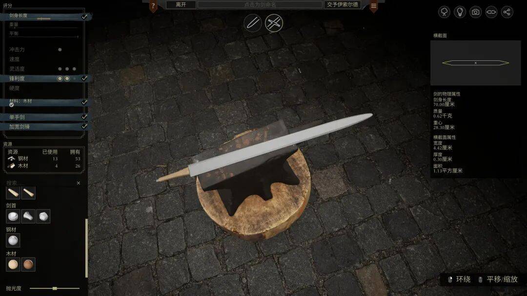 刃体成型后,玩家还需为武器选择不同材质与外观的剑格、剑把与剑手。随着进度推进,更多材料、图纸与进阶功能将逐步解锁,包括异形剑身、雕刻系统,以及对剑身各结构尺寸与曲度的自由调整。从这个角度看,本作更接近一套逐步开放权限的数字建模工具。