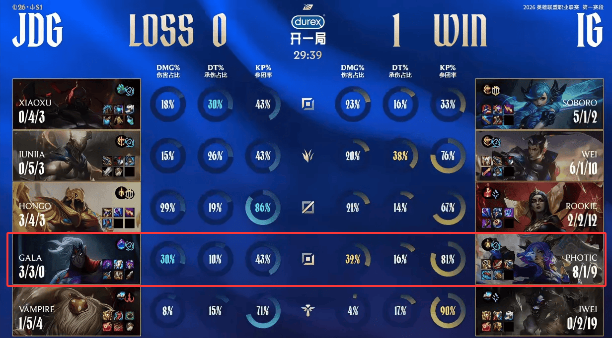 说实话,在看完第一局比赛后,估计有不少人为JDG捏了一把汗,IG下路photic竟然线杀了Gala,明明大家都是硬辅,却出现一边倒的局势,赛后有网友锐评道:“30分钟的局,Gala不是在逃就是在砸兵”。当Photic完成超神后,JDG已无力回天。