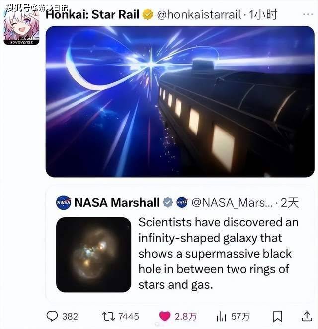 说真的,这已经是米哈游第几次被玩家调侃动用时光机了?早前NASA观测到类似翁法罗斯的星系,黑洞位于两个原子核的中间,形成了“∞”的形状,当时这事闹得星穹铁道官方都下场转发“认领”,引发玩家的一场狂欢。