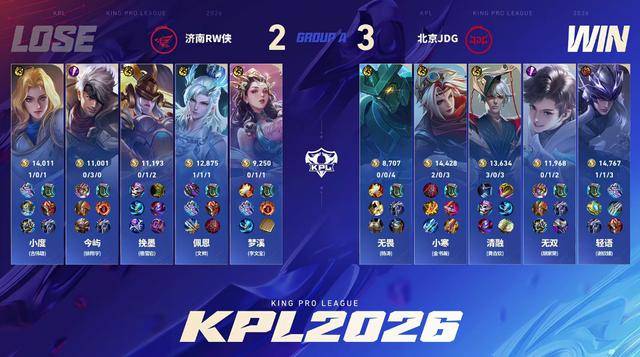 双方打到后期经济基本持平,无双拿到龙之后,JDG全员追击。镜换位之后大招直接锁到残血戈娅完成收割,回头刚好击杀不知火舞,橘右京复活站起来之后,无双配合轻语守尸,拿了一波三杀,这局无双也成功拿到了MVP。