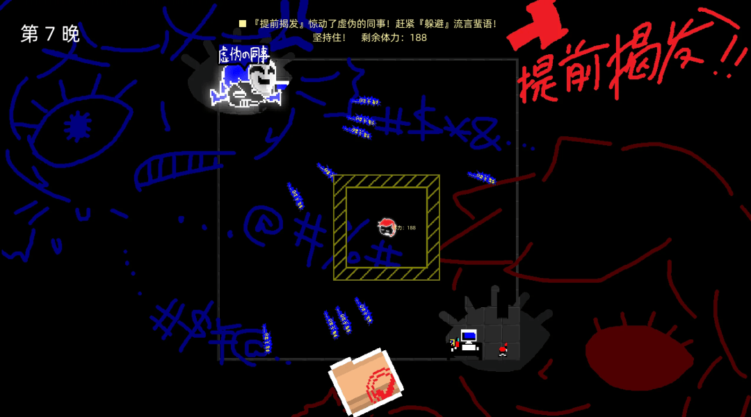 GlobalGameJam2026,主题“Mask”。我做的游戏是《面具公司》在这个游戏里,为了揭发一个虚伪的同事,你需要在白天的时候观察并【记忆】公司里的证据分布情况,在夜晚抹黑去找到全部证据并进行【完美揭发】。你的移动方式是【走格子】,每走 1 格会消耗 1 个【体力】,当最少找到 1 份证据时,你可以选择是否发起【提前揭发】,提前揭发会遭来流言蜚语,你需要进行【快速躲避】(躲避过程也会消耗体力),如果【完美躲避】则可以获得大量体力,并暂时照亮剩下的证据。看看你能坚持到第几个晚上吧!