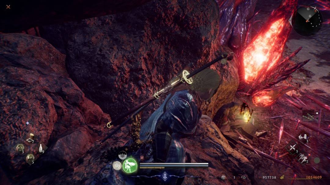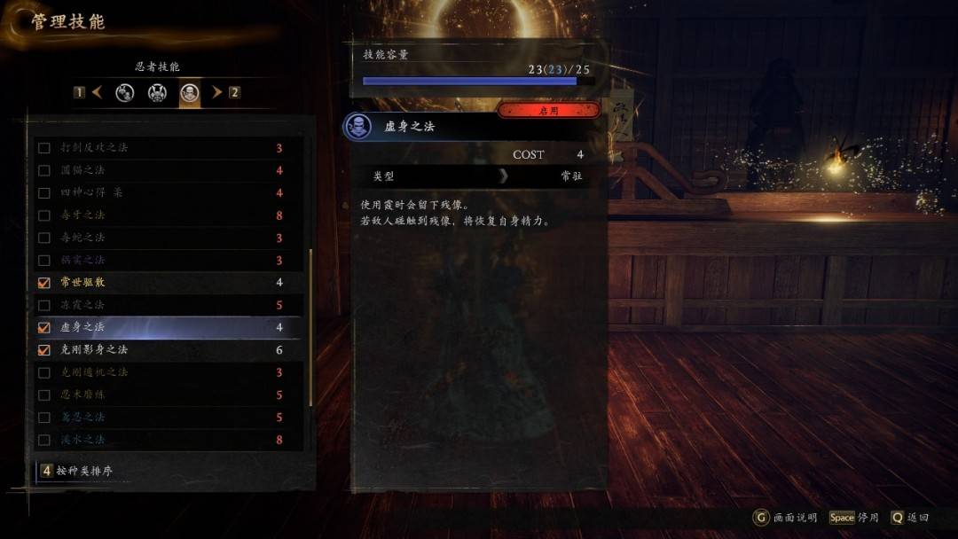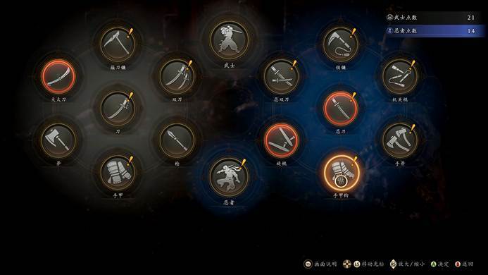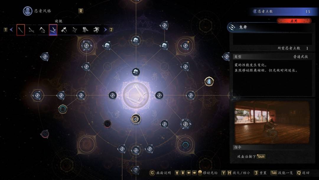 忍者形态没有残心流转后,的确会影响角色的精力回复速度,但Team Ninja用了一些手段,补足了这方面的劣势。这里正好插入本作的技能系统。Team Ninja把很多实用的词条和武技效果打散重组,放进了这个可以自由搭配的技能系统里。