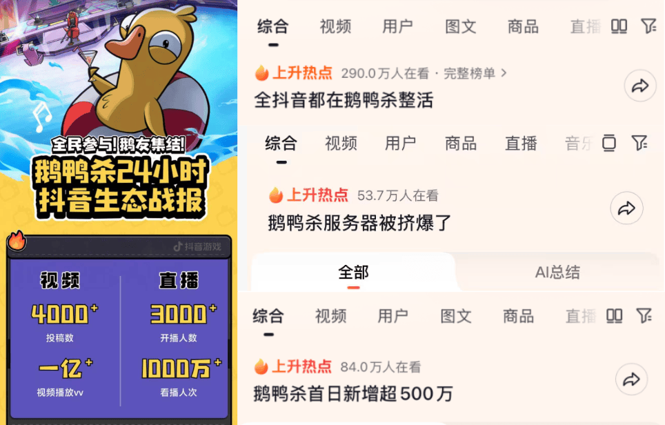 具体一点说,在公测当天晚上,我们自建的综艺IP《鹅斯卡之夜》第二季就在虎牙、抖音等全网渠道正式播出了。大司马领衔全明星主播阵容一起来组队,参与一场合家欢氛围的《鹅鸭杀》。我们还发起吕德华、寂然等主播,跨越虎牙、抖音等多个平台直播联动,再结合达人的采买、头部主播的开播等等,把开服的声势做大。在抖音,我们首个24小时的视频投稿量就超过4000条,视频播放量超过一个亿。