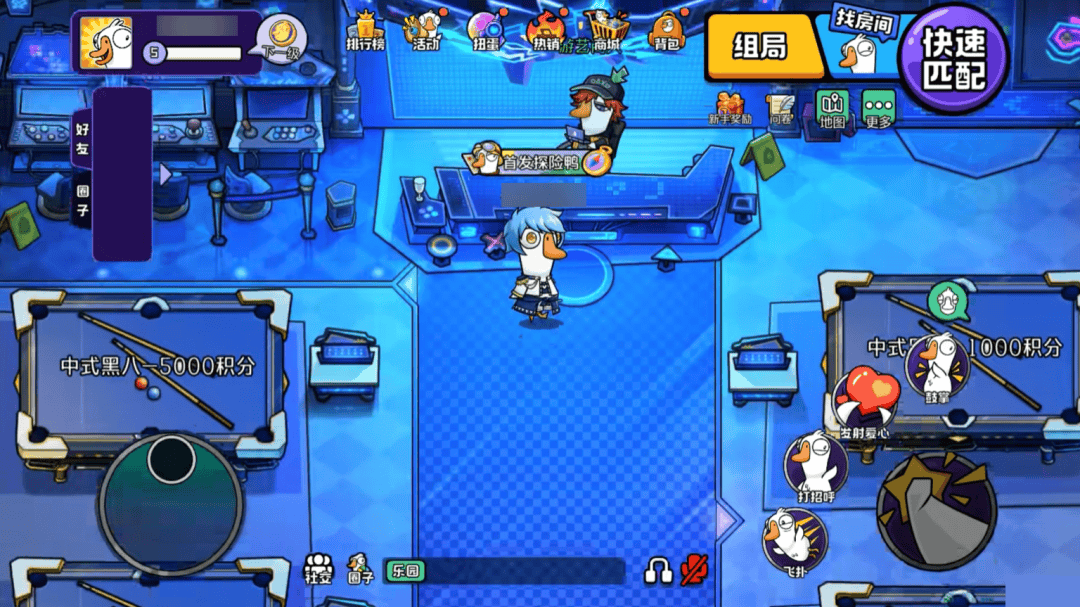 我们今天的版本里已经有了很多原版端游没有的社交玩法,比如你可以在大厅和朋友一起打桌球。点进“组局”,我们每个人还有一个自己的私人岛屿,可以邀请朋友来一起做客。这个岛屿还只是一个雏形,后面我们有一系列非常丰富的基于社交玩法的规划。