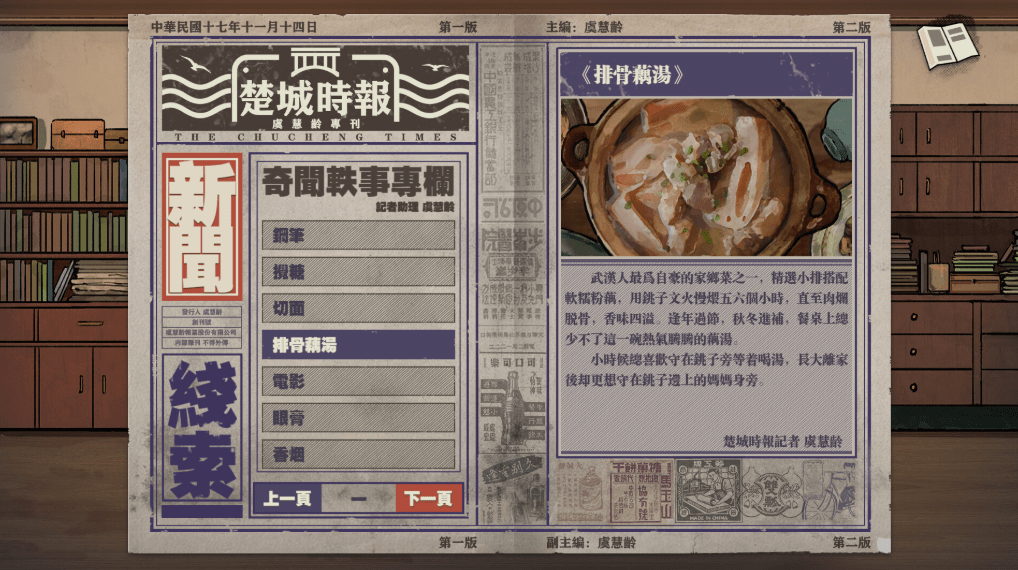 - 定格时光的收集系统 —— 发挥虞慧龄的新闻记者特长,去收集那些具有民国色彩的事物吧!也许是一样物品、一个文化符号,让这些收集品将悠悠时光定格在这一瞬间。