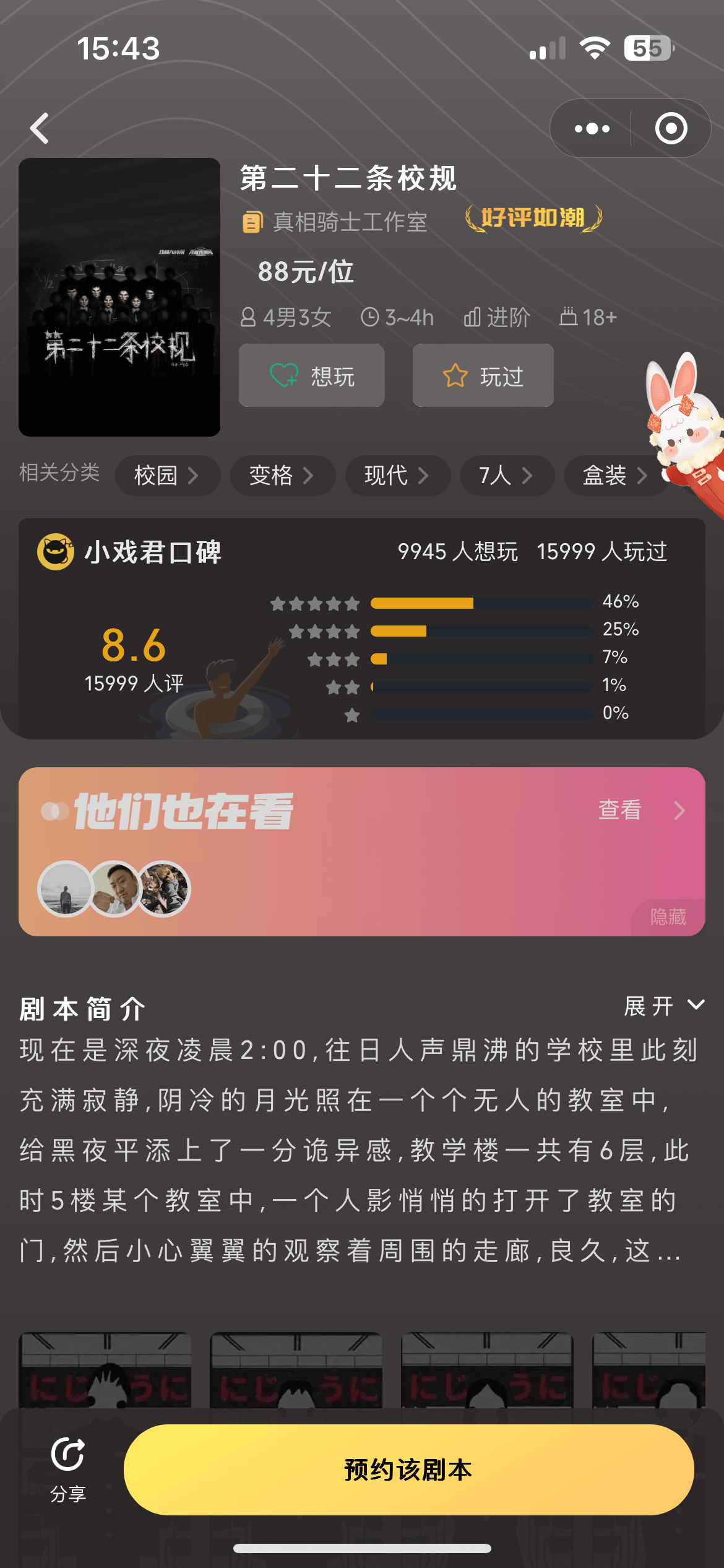 玩家在选到喜欢的剧本后,可以在线预约组局,与好友一起组队体验游戏。
