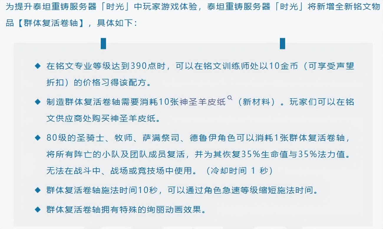 相信大家在体验过怀旧服熊猫人之后,都会发出这样的感叹:“群体复活真乃神技”。不错,它给予了所有打本团队极大的便利。于是乎,就有玩家提议给时光服也整一个!话音刚落,官方就在今天发布蓝贴新增铭文物品“群体复活卷轴”,这意味着时光服玩家以后再也不用挨个复活了。