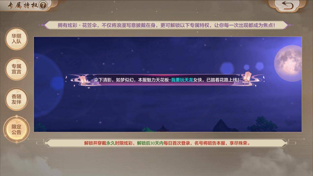 它不仅外观绚丽浪漫,更具备一系列令人心动的专属特权。少侠解锁后,可自定义独家进队宣言,配以流光溢彩的专属入队界面特效。