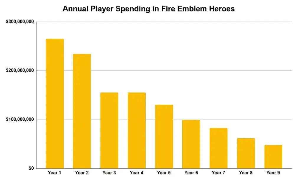 作为任天堂唯一一款流水超过10亿美元的手游,《火焰纹章:英雄》首年就营收2.651亿美元,之后每年基本都在走下坡路,而如今第九年的收入为4790万美元,为第一年收入的18%。(注:《宝可梦Go》由Niantic主导开发和运营,后者已经在去年被知名沙特控股的游戏开发商Scopely收购)