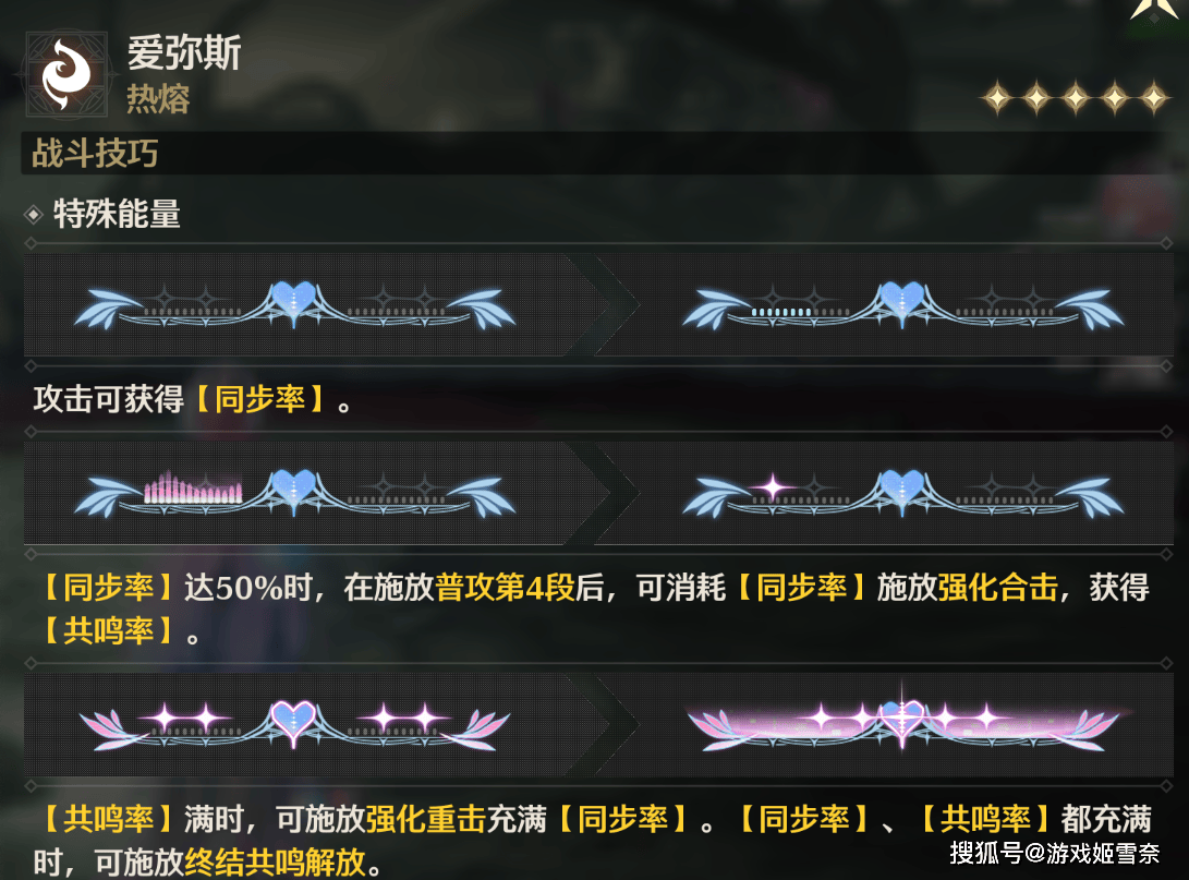 看人先看回路条,爱弥斯的回路条由下方的同步率和上方的星星形态的共鸣率构成,爱弥斯的玩法简单来说就是攒星星(共鸣率),星星满了释放强化重击充满双条开二段大招。所以如何获得星星就是弄清爱弥斯玩法的基础。