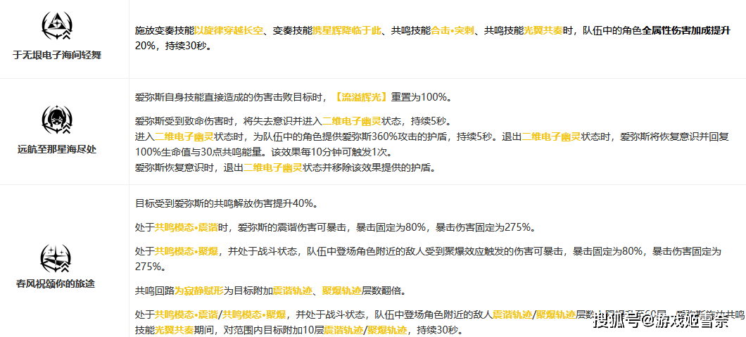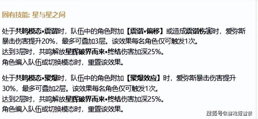 固有技能方面,优先点亮第二个,队友造成震谐相关伤害时提升爱弥斯爆伤20%,最高叠三层60%,聚爆相关伤害提升30%爆伤,最高两层60%,白嫖的爽爽吃!