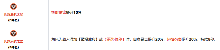 新声骸套装长路启航之星,提升热熔伤害,触发偏谐相关机制时提升20%暴击率和热熔伤害,43311,4C辛吉勒姆,主词条暴击爆伤,C3一攻一属,C1大攻击,充能推荐120%。