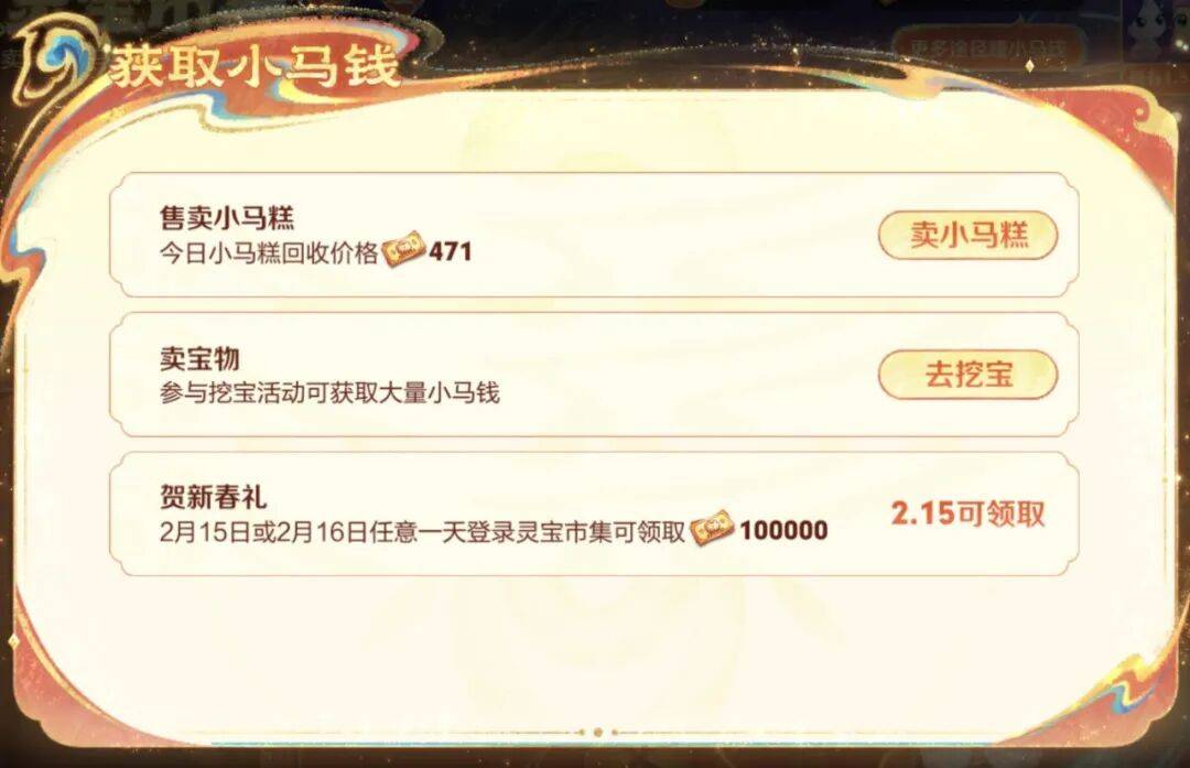 大致算了一下活动时间内,如果运气好,差不多能拿到40万左右的小马钱。所以,自行安排如何兑换吧。我今天卖小马糕是15000的小马钱,如果加上挖宝的,理想状态应该有20000小马钱。15天活动,那就是300000小马钱。而2月15日当天,还有额外的100000的小马钱。当然,这只是理想状态,因为高价小马糕和随机挖宝都是变数,不可能运气一直那么好。额外可能还会有5%小马糕的商店收益,如果你能刷到高价收购的话。以及不确定的挖出宝贝的价值,我有看到价值8888小马钱的宝贝。