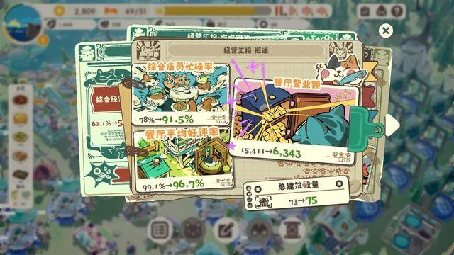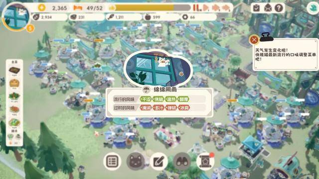 解决了员工安排之后,作为餐厅最重要的就是能做出什么菜!不同的菜品设定了不同的数值与属性:售价、声望等数值决定了每卖出一份该菜品时餐厅的收益,而收益越高的菜品所需烹饪时长也越久;属性代表了菜品的特性。随着时间的流逝,游戏内的天气也将发生相应的变化,例如在“闷热的午后”会流行清脆、冰爽的菜式,焦脆、干涩的菜式就没那么受欢迎。而在“绵绵阴雨”中,小猫咪们会倾向于点温热、醇厚的菜品,而清凉的风味则会显得有些不合时宜。菜品的选择不但将影响餐厅营业额,准备好应季菜式的话也会相应提升餐厅的评价,将于餐厅升星息息相关。为此,玩家需要根据天气变化来适当调整菜式。