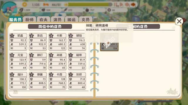 除了数值之外,这些小猫咪也会根据技能分不同的类型。有些擅长在厨房工作的,有一定几率节省食材;有些擅长当服务员的,则有几率获得更多小费。根据不同的能力将小猫咪分配在不同的岗位上,以提升餐厅的运作效率!