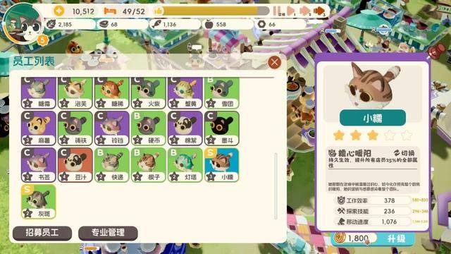 首先,要雇佣小猫咪员工的话需要建造宿舍,之后就可以在员工菜单进行招募。招募的动画非常有趣,类似手游抽卡,但是打开的是航空箱,想必在现实生活中养过猫的玩家一定会觉得非常亲切。除了通过支线任务收集到的小猫咪以外,在卡池中共能开出48只小猫咪,并且会根据小猫咪的技能效果和数值,用S、A、B、C这几个不同的等级进行标注。祝大家在游戏中都开出绝世好猫!