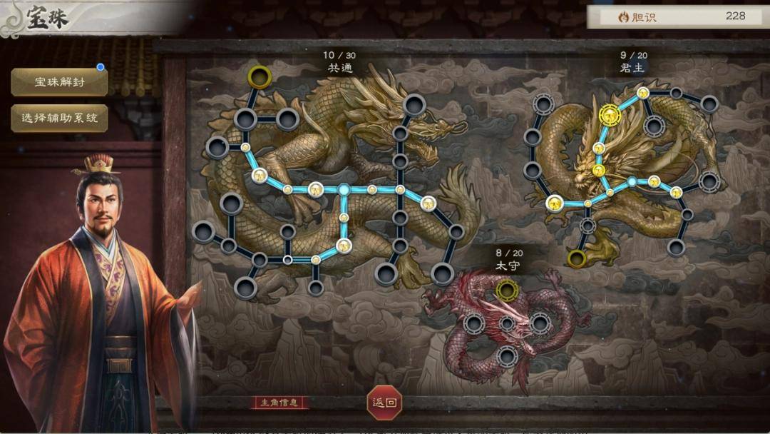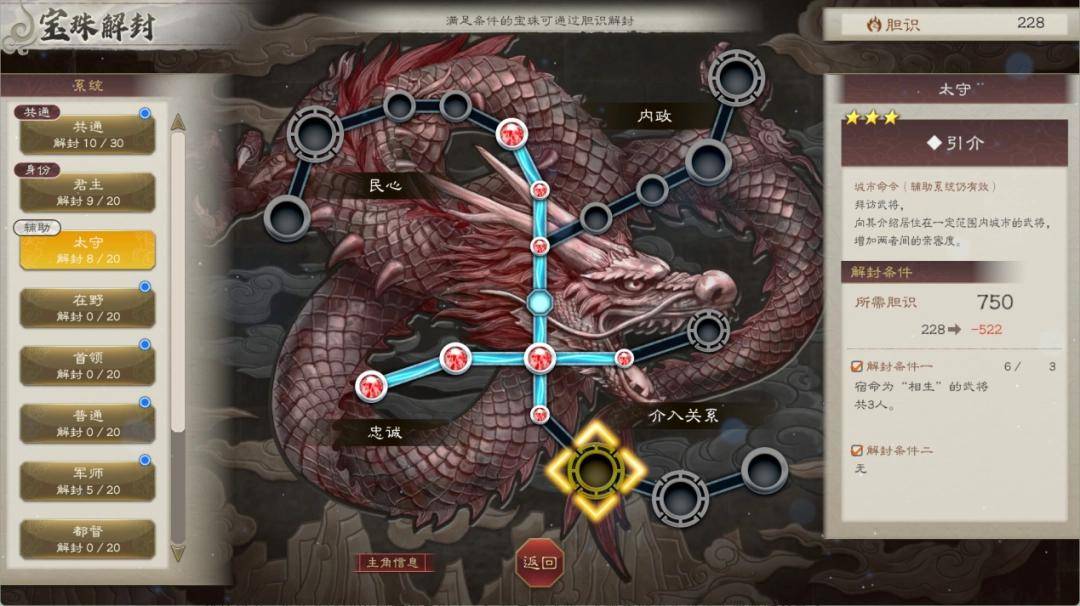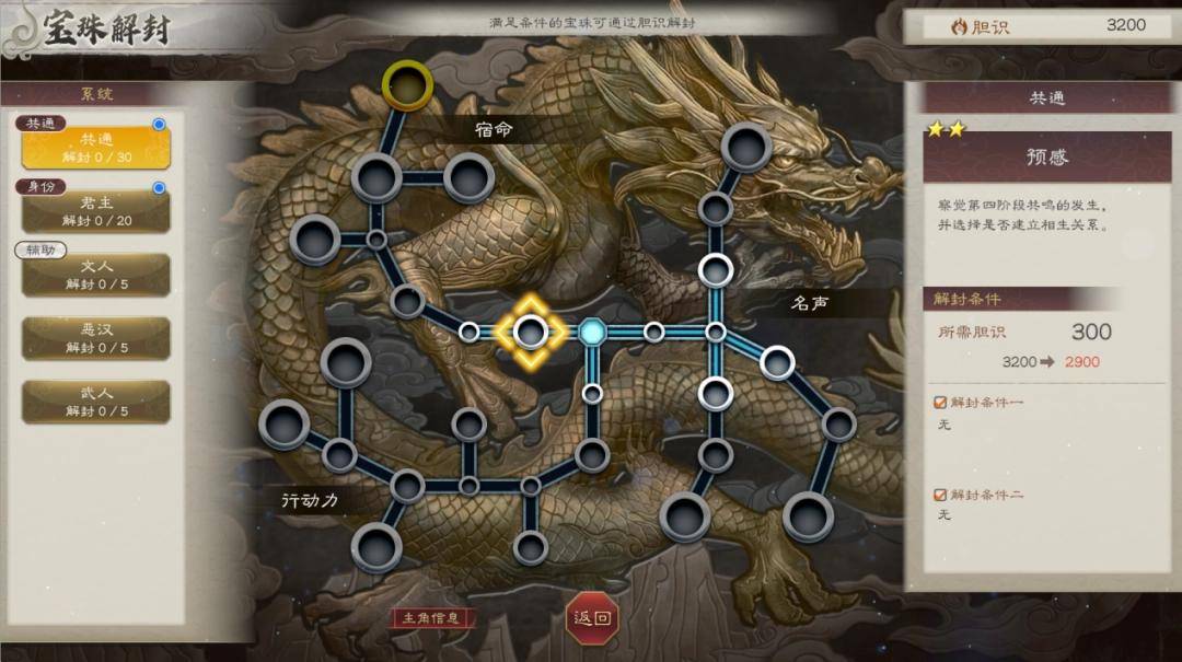 简而言之,“宝珠”就是一套类似《三国志13 威力加强版》威名系统的天赋树系统,通过消耗专属资源“胆识”,玩家便能依据自己的身份,点出相应的技能。每名角色拥有三套天赋系统,一条共通线,一条身份线,一条辅助线。