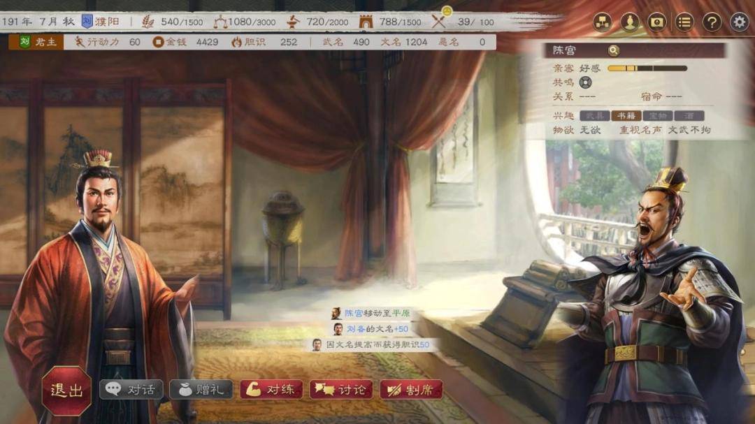 不仅如此,小回合中的社交、养成元素也相当单薄,无非就是点击左键消耗精力,换取经验、任务进度、武将好感度等资源,既没有“太阁”那样的小游戏,又缺乏武将之间的独特互动,放到今天看来枯燥无比,武将互动全靠脑补。