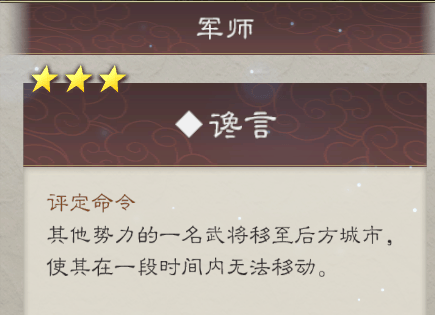 在这些身份线中,最变态还得数“军师”的天赋树。在战斗中,军师能刷新己方武将已使用的战法,强制智力低于90的敌军落入陷阱;在战略阶段中,军师又能让友方武将和自己进行“再动”,还能化身超时空秦桧给敌方首领送去谗言,令其十二道金牌召回前线将领软禁在后方……