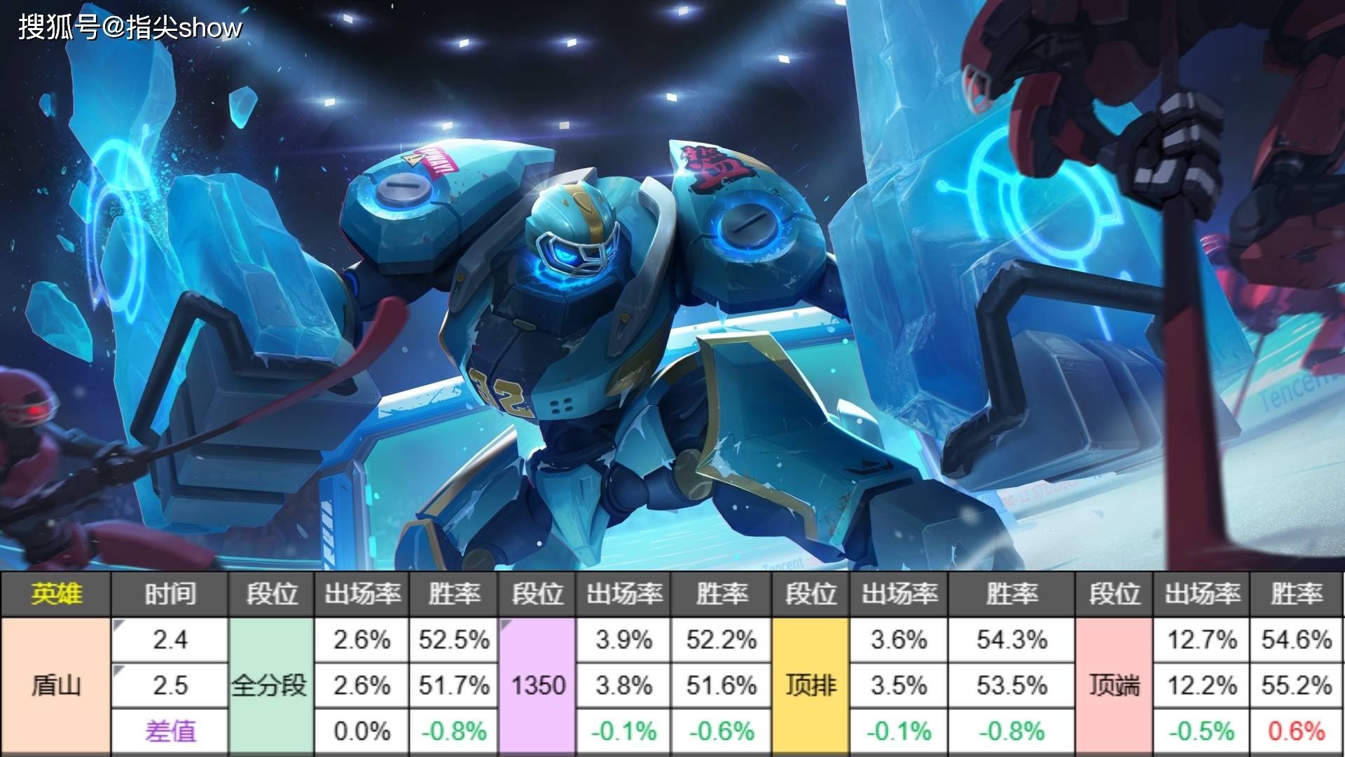本次调整如果用盾山调整的视角来看,数据呈现是有点反差的,明明是纯粹的削弱,顶端局胜率甚至还涨了,因为禁用率降低,出场率倒是也涨了一些。